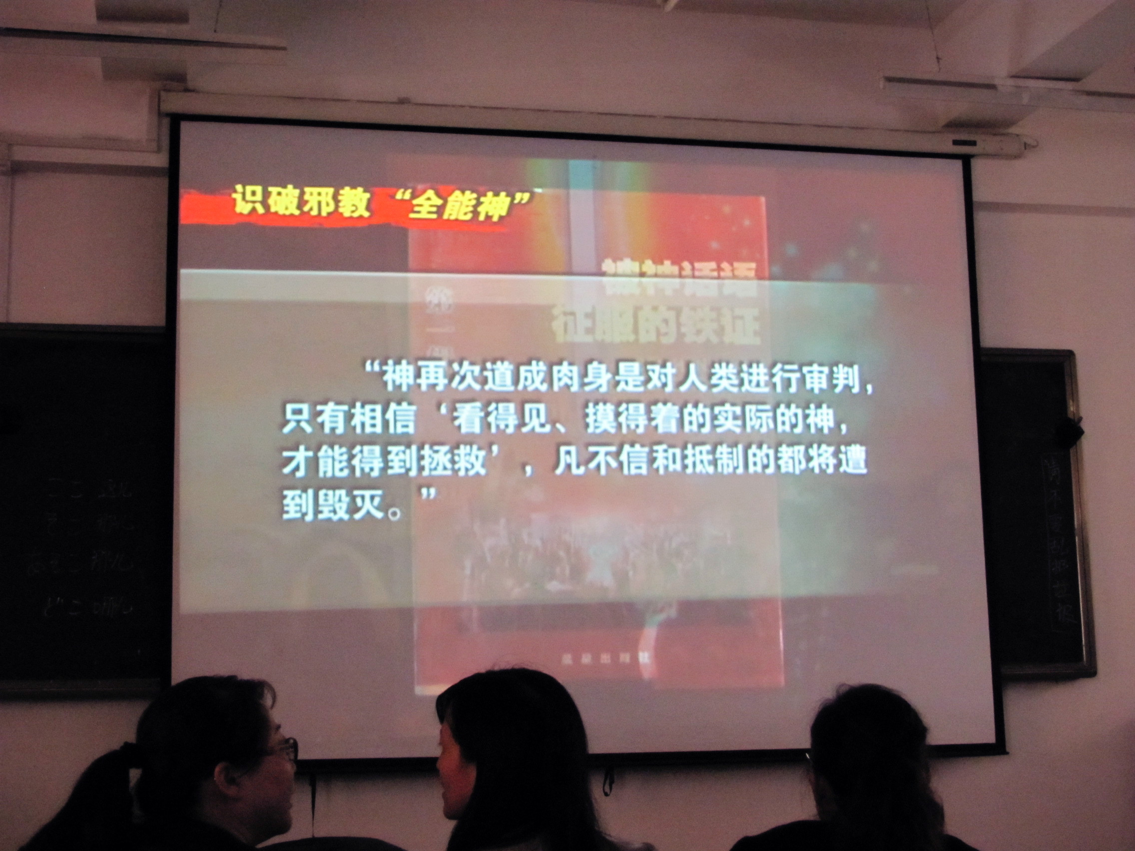 最后,佟老师给大家播放了识破邪教——全能神”纪录片,全院师生都认真的观看了短片,通过观看宣传片,了解到全能神”的丑恶面目和罪恶行径。在观看了宣传片之后,全院师生针对全能神”邪教组织的极端恶行和严重危害展开了激烈的讨论。佟老师呼吁,作为新时代的祖国骄阳,同学们要积极的行动起来,为铲除邪教组织,全面建成小康社会,构建和谐社会而共同努力。