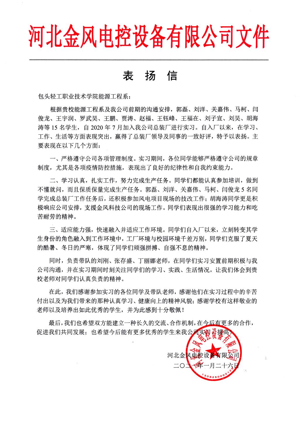 河北金风致包头轻工职业技术学院能源工程系表扬信