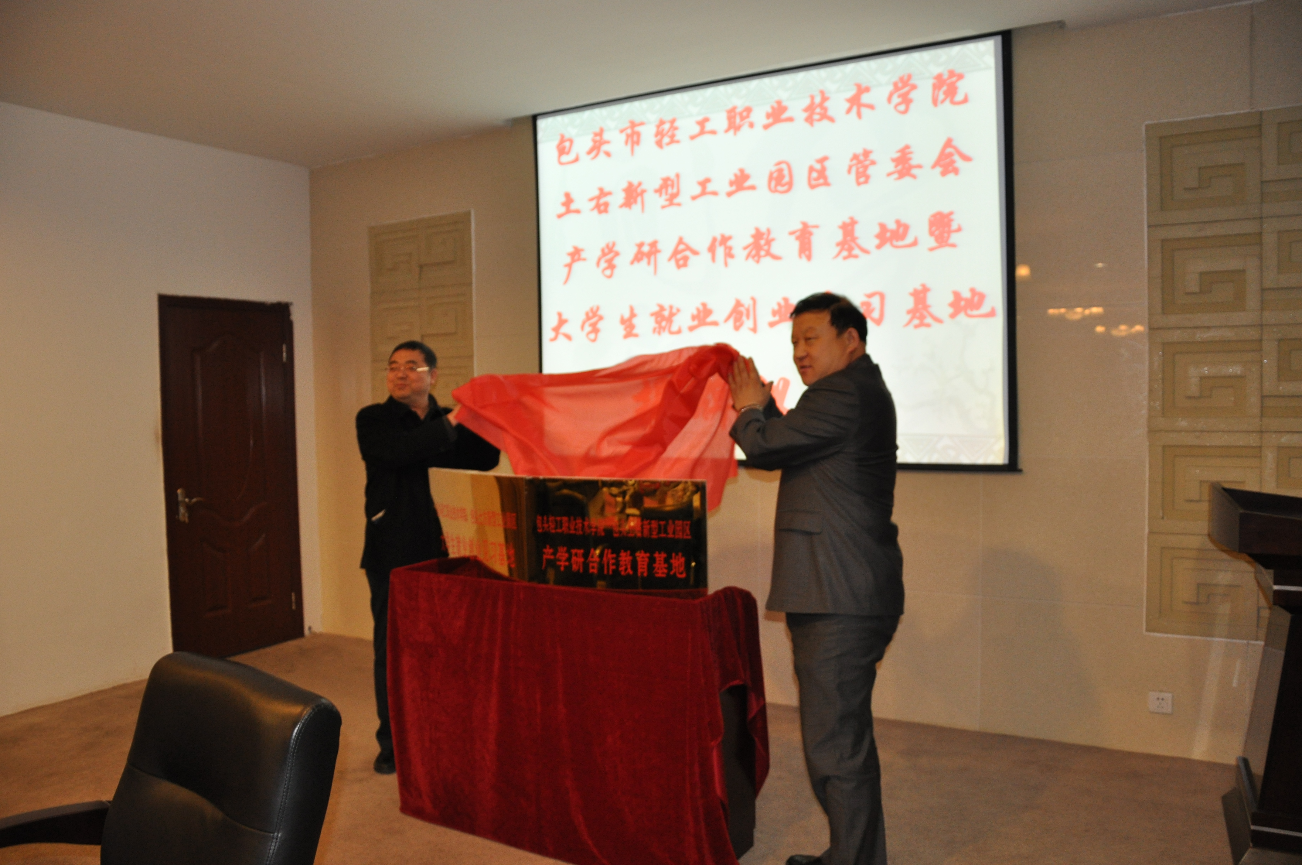 仪式上,党委副书记、院长任雁秋和包头土右新型工业园区管委会主任贾保良分别致辞。双方表示,校企合作、工学结合是培养高技能人才的必由之路,双方将利用各自优势,本着合作育人、合作共赢的原则,在人才培养、技术研发、产学研究、学生实习、就业创业等方面开展广泛合作,共同为地方经济、社会发展做出积极贡献。随后,任院长代表我校与包头土右新型工业园区管委会签定了共建产学研合作教育基地协议书,并为包头轻工职业技术学院与包头土右新型工业园区产学研合作教育基地”和包头轻工职业技术学院与包头土右新型工业园区大学生就业创业见习基地”揭牌。